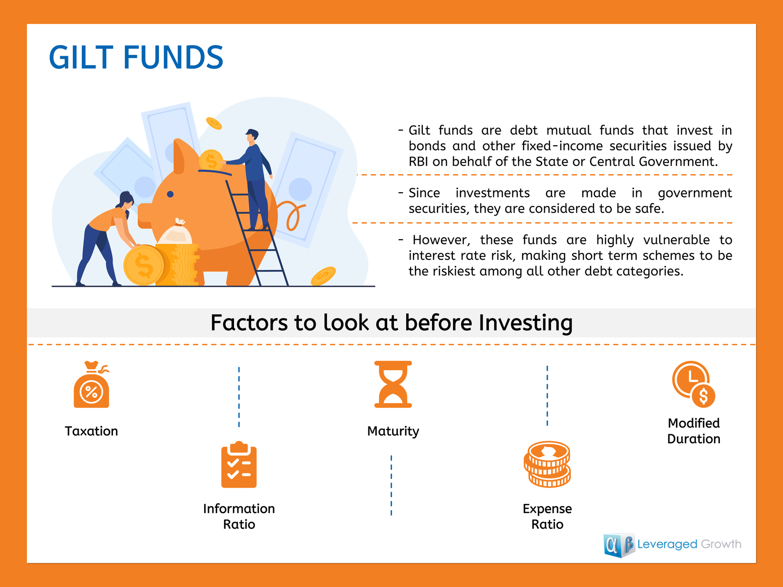 What are Gilt funds? Gilt funds are debt mutual funds that invest in bonds and other fixed-income securities issued by RBI on