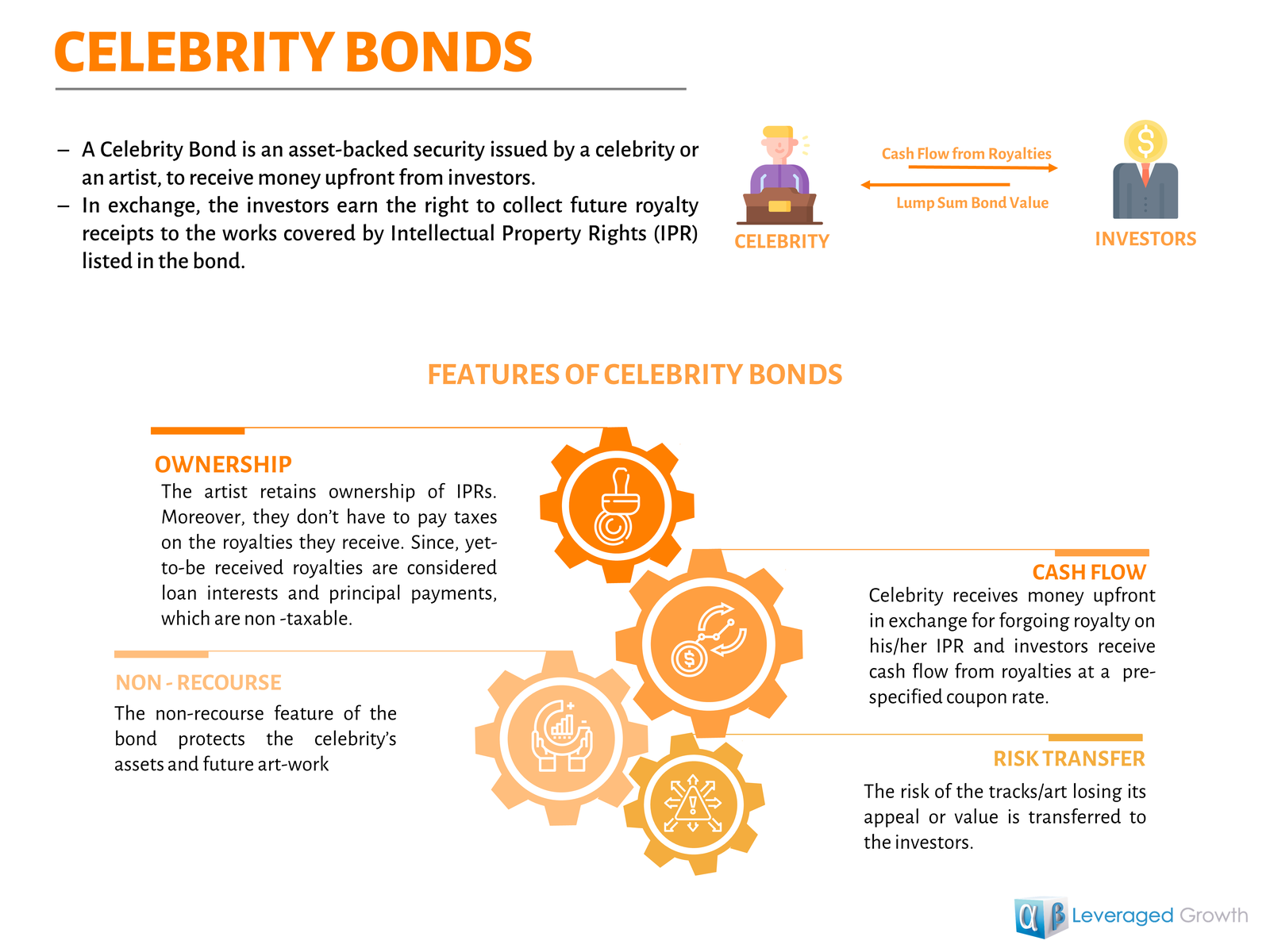 A Celebrity Bond is an asset-backed security issued by a celebrity or an artist to receive money upfront from investors. In exchange,