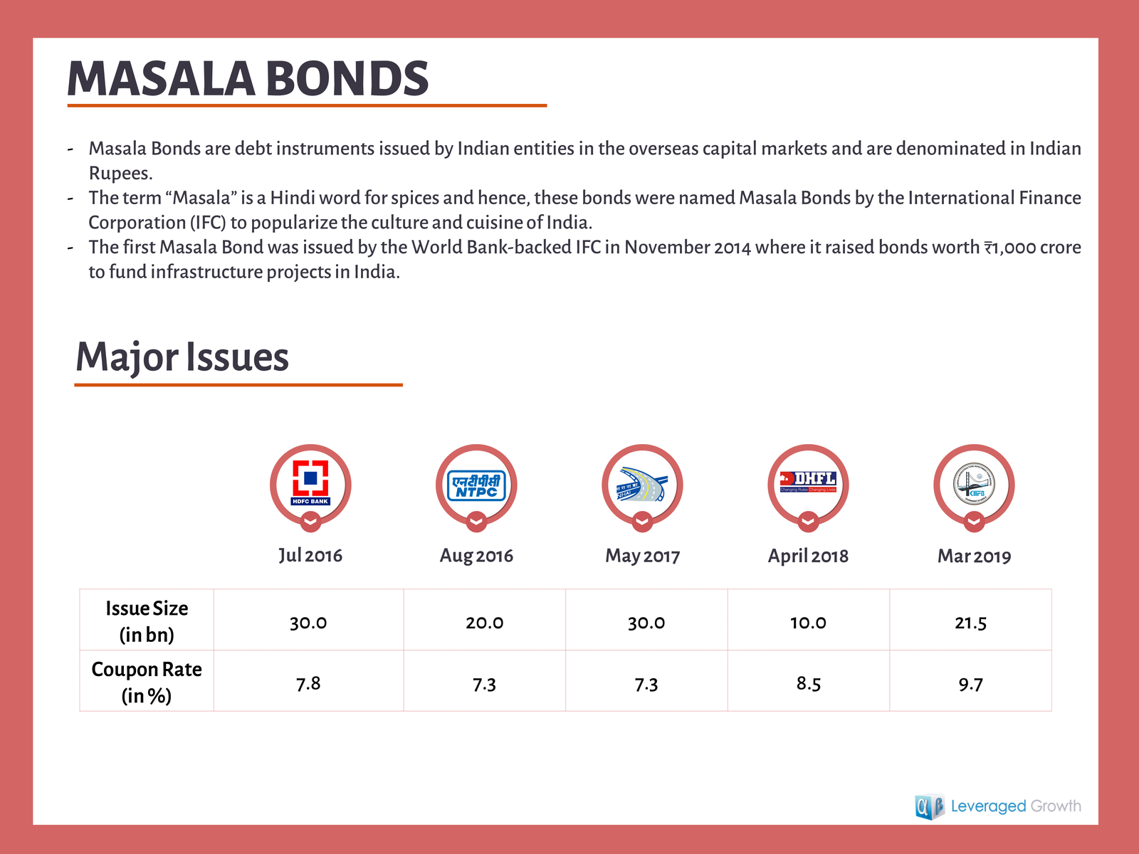 Masala Bonds are Indian Rupee (INR) denominated debt instruments that are issued by Indian entities in the overseas capital markets. The term