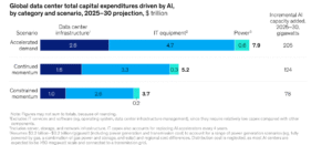 McKinsey’s April 28, 2025, report estimates capital investments to support AI – related data center capacity demand could range from about $3 trillion to $8 trillion by 2030.[20] If the demand for AI continues, this investment could exceed Germany’s 2025 GDP of $4.74 trillion[21] and India’s $4.19 trillion,[22] representing more capital than the world’s third and fourth-largest economies produce annually.
