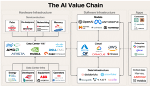 These applications are not independent. They operate on cloud infrastructure, use AI models from model makers, and run on hardware from chip manufacturers. Everything is interconnected.