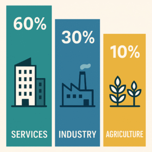 Maharashtra is currently working towards an ambitious goal: becoming a $1 trillion economy by 2030, with a long-term vision of reaching $5 trillion by 2047. Today, the state accounts for the highest Gross State Domestic Product (GSDP) in India. The services sector dominates with roughly 60% of output, followed by industry at around 30%, and agriculture making up the rest.