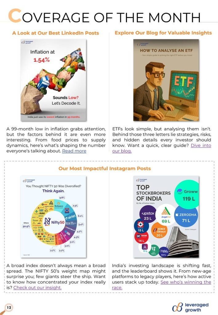 This month’s edition brings you a curated snapshot of our most insightful and engaging content across LinkedIn, Instagram, and our research blog. From unpacking India’s inflation trends to decoding ETFs and analysing market concentration within the NIFTY 50, we’ve highlighted the posts that sparked the most. Dive into this month’s snapshot to explore global markets, investor behaviour, evolving market dynamics, and the stories that shaped financial discourse. You’ll also find crisp updates on currency movements, commodity trends, Indian market performance, and several other financial insights that keep you ahead of the curve – all in one place.