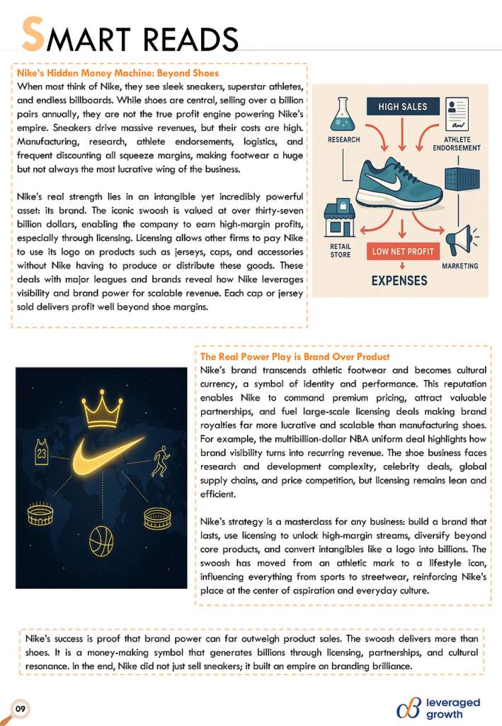 Nike’s true power lies not just in selling shoes but in building an unstoppable brand empire. By monetizing licensing, endorsements, and cultural influence, Nike generates billions beyond footwear margins. Its swoosh symbolizes lifestyle, performance, and aspiration, turning visibility into recurring revenue. The brand has shifted from athletics to becoming a global icon at the center of culture and everyday life – proving that in business, brand supremacy can outpace product sales.