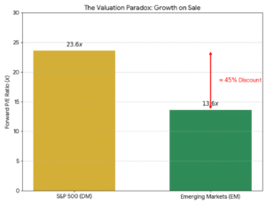 The S&P 500 currently trades at a Forward P/E of approximately 23.6x, a premium that reflects decades of perceived safety and deep capital markets. The MSCI EM Index, by contrast, trades at roughly 13.6x, a discount of approximately 45%. It is worth noting that a valuation gap between developed and emerging markets is historically persistent and not unusual in isolation. What makes the current spread notable is its combination with improving EM fundamentals, monetary independence, and reduced external debt vulnerability — factors that the legacy discount does not adequately reflect.