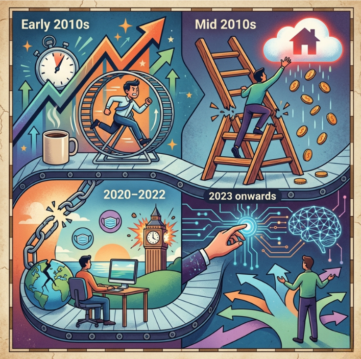 2023 onwards:  AI enters the stability conversation. The careers that young people were told to build toward are visibly in flux. Planning thirty years ahead for a role that may not exist feels less like prudence and more like guesswork.